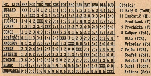 Pořadí střelců: 1. Dušan Malý 12 gólů, 2. Jirka Hroník 6 gólů, 3. Petr Neumann 4 góly, 4. Arnošt Barták 2 góly, 5.-6. Pavel Malý a Pavel Strnad po 1 gólu.