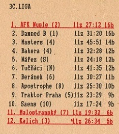 11. kolo: Tučňáci - Malostranský SK 4:2 (2:0), Neumann 3, Malý 1. Sestava: Mirek Šoukal - Pavel Malý, Jirka Hroník, Petr Radvák, Petr Neumann, Arnošt Barták, Dušan Malý.