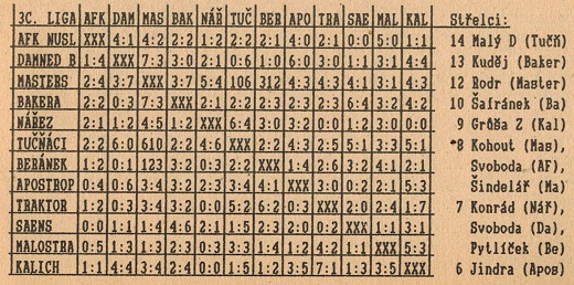 9. kolo: Tučňáci - Dusup 6:0 (2:0), Hroník 2, Malý 2, Strnad 1, Neumann 1. Sestava: Mirek Šoukal - Pavel Strnad, Jirka Hroník, Petr Neumann, Arnošt Barták, Dušan Malý.
