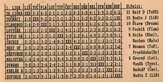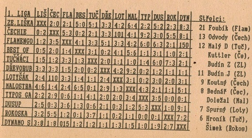 6. kolo: Tučňáci - Dřevorubci 2:2 (2:0), Malý 1, Hroník 1. Sestava: Mirek Šoukal - Pavel Strnad, Jirka Hroník, Petr Neumann, Arnošt Barták, Josef Hiršl, Dušan Malý.