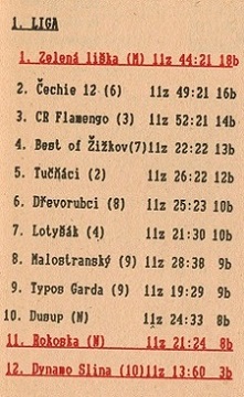 11. kolo: Tučňáci - Flamengo 3:3 (1:3), Malý 2, Barták 1. Sestava: Mirek Šoukal - Pavel Malý, Pavel Strnad, Petr Neumann, Arnošt Barták, Dušan Malý.