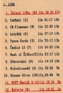 11. kolo: Tučňáci - Malostranský SK 4:2 (2:0), Neumann 3, Malý 1. Sestava: Mirek Šoukal - Pavel Malý, Jirka Hroník, Petr Radvák, Petr Neumann, Arnošt Barták, Dušan Malý.