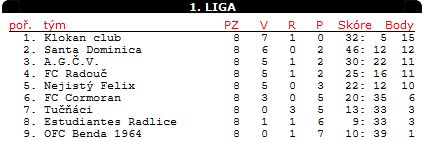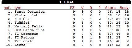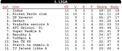 Pořadí střelců: 10 - Petr Maňas, 7 - Roman Žítek, 4 - Jirka Hroník, 1 - Standa Lehocký, Ivan Moravec, Vlasta Kolečkář.