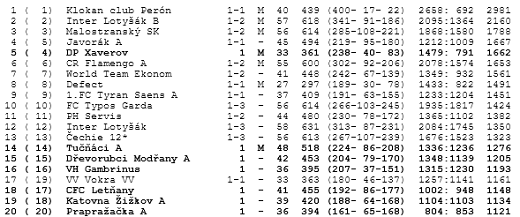 13.01.2022 12:23V roce 2016 skončil své účinkování veteránský mančaft Tučňáků, se třemi mistrovskými tituly náš nejúspěšnější tým, přesto si v historické tabulce drží 14. místo. Čísla znamenají tyto údaje: Pořadí po sezóně Podzim '21, pořadí po sezóně P '20 / J ´21, název týmu, dále je uvedeno, jakou ligu hrál nejvýše a jakou ligu hrál v sezóně Podzim '21, "M" znamená, že byl mistrem, počet sezón, počet zápasů (V-R-P), skóre, počet bodů (např. bod v 1. lize jsou 4 body, ve 2. lize 3 body, atd.).