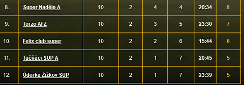 29.11.2021 12:27Po deseti kolech první superveteránské ligy má pět mužstev na svém kontě pouhá dvě vítězství. Sestupové starosti už ale netrápí osmou Super Naději, která k nim přidala čtyři remízy a jejích dosavadních osm bodů má punc záchrany. O tu tak bude bojovat zbývající čtveřice. Deváté Torzo potřebuje k definitivě bod se třetím Indusem (14 bodů), desátý Felix výhru nad pátým Defectem (9 bodů). Tato dvě mužstva tak mají vlastní osud ve své moci. To Tučňáci a Úderka musejí čekat na jejich zaváhání. Tučňáci vedle svého vítězství nad Super Nadějí potřebují k záchraně prohru Torza (ve vzájemném utkání zvítězili 5:3), nebo nevýhru Felix clubu (vzájemná remíza a lepší skóre), na výsledku Úderky jim vzhledem k vítězství 3:2 ve vzájemném utkání nezáleží. Úderka potřebuje kromě plného bodového zisku se čtvrtým Gold La Plate (10 bodů) zároveň nezdary Torza a Felixu, nebo nezdar jednoho a selhání Tučňáků.
