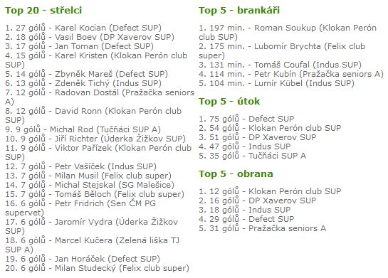 06.12.2019 09:43Do statistik podzimních soutěží se z Tučňáků výrazně zapsal jen nejlepší střelec suprů Michal Rod. Jen osm střelců z elitní superveteránské soutěže skórovalo častěji než náš šutér. Mezi dvacítku nejlepších patří i autor 6 branek Karel Janďourek, ale doplatil na přetlak šestigólových střelců, s nimiž se dělí o šestnácté místo.
